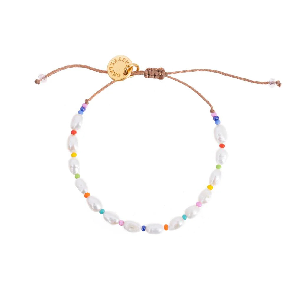 - Perla linda bracelet - Rainbow: Handmade with natural pearls and 5mm Swarovski beads. Brass hardware plated in gold.