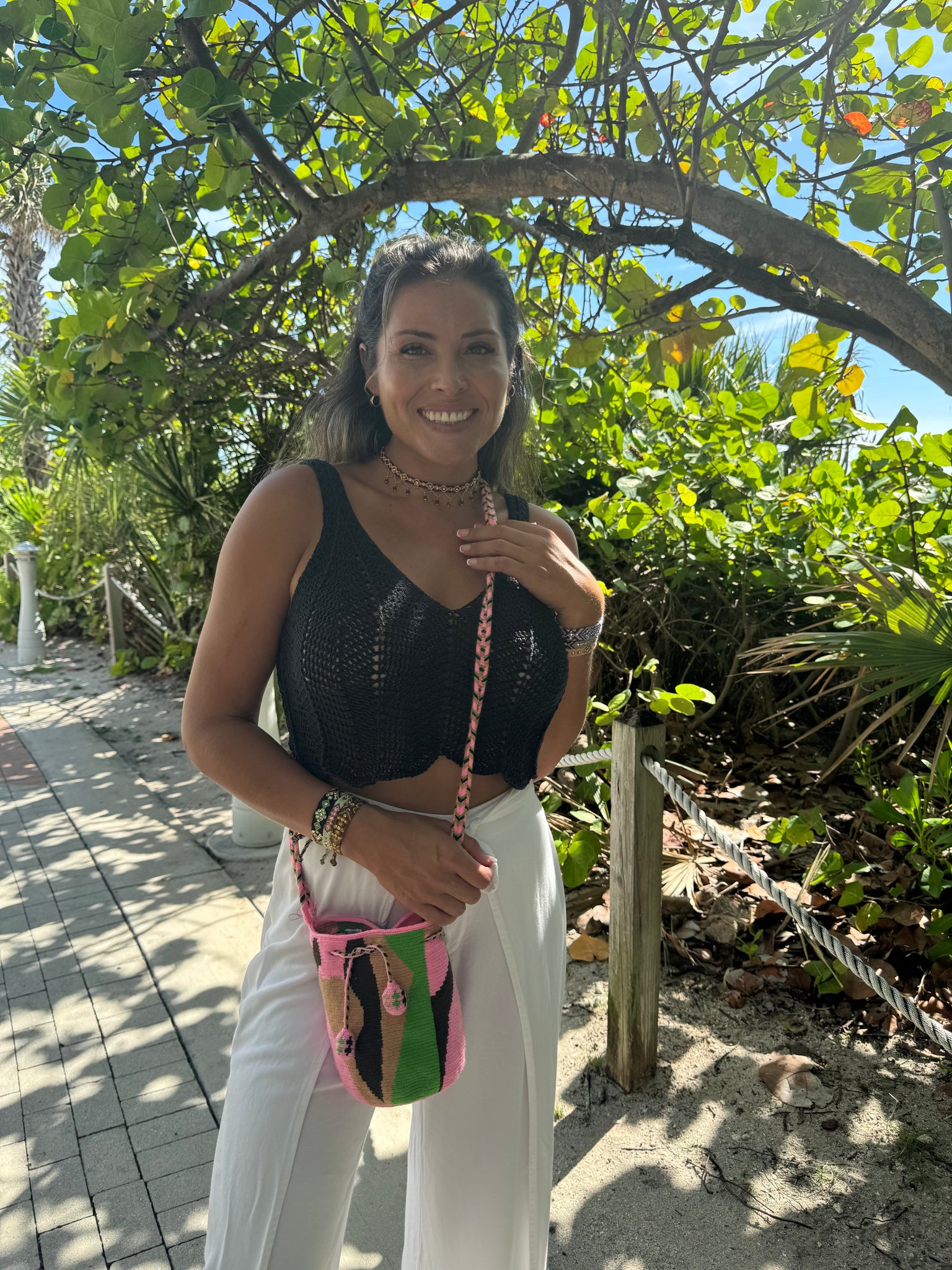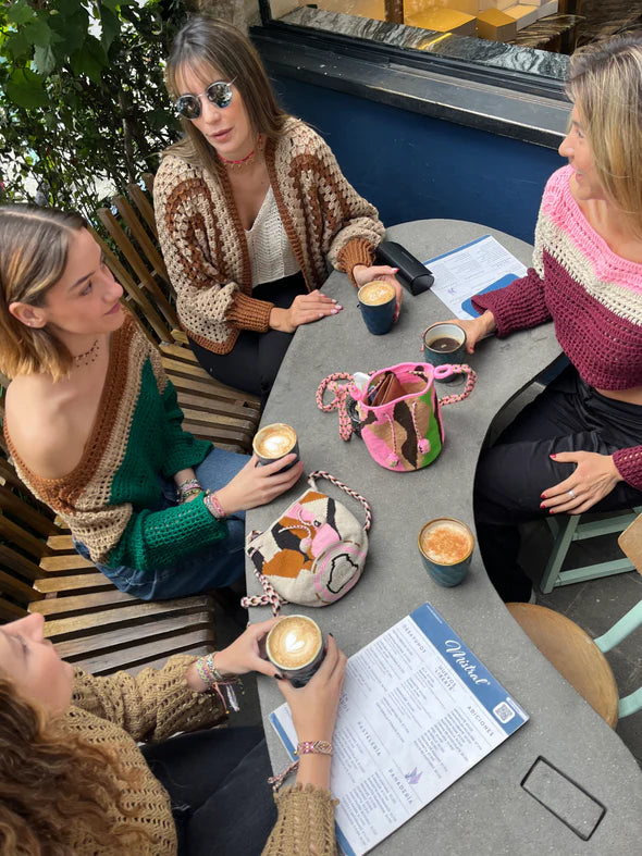 Our Makki Pouch backpack is handwoven by artisan women from the Wayuu community using crochet techniques, with its pattern symbolizing cultural heritage and ancestral preservation.